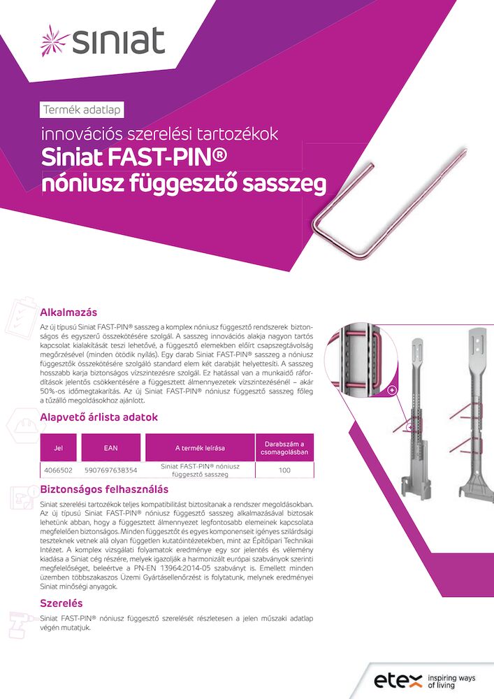 Siniat FASTPIN szerelési tartozékok- Termék adatlap
